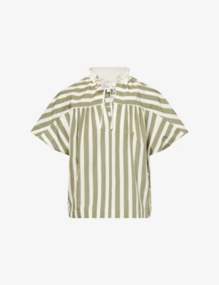 Striped Short-Sleeve Tie-Neck Cotton-Silk Top