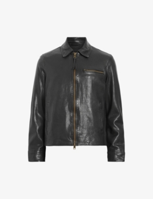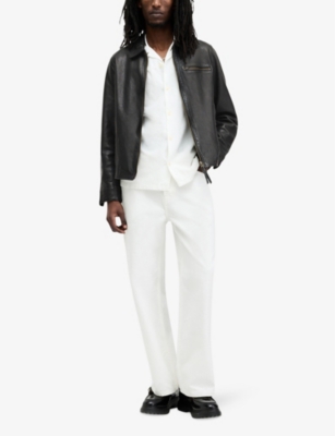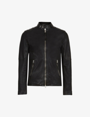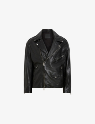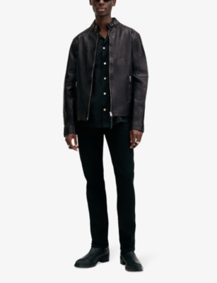 Discover an AllSaints hallmark in the form of a classic men's leather biker jacket with silver-tone hardware, popper-fastened flap pockets and chunky belted hems, and uncover slim-fit iterations with snap-back collars and tonal panel detailing at the shoulders. You'll see vintage-style pieces washed and tumbled for an authentic feel and they come complete with notched lapels. Look out for securely zipped pockets to keep all your belongings safe, and eye-catching gleaming buckles and chain details that add to the biker spirit.