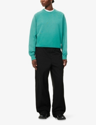 Our Carhartt WIP women's offering reflects the brand's history of supplying workwear garments. Maintaining its trademark utilitarian style, Carhartt WIP clothing stocks fundamental items for your wardrobe. Expect to see jersey basics that are ideal everyday companions. Boxy, round-neck T-shirts and oversized sweatshirts are constructed from soft cotton and finished with a woven logo label. You'll find them in neutral colours and earthy shades.Â