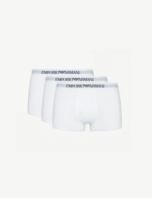 Armani underwear for men is made from comfortable, breathable cotton, with ample stretch for day-long comfort. Boxers fit neatly around the waist with a smooth, streamlined fit. Emporio Armani men's briefs boast a snug and supportive shape, and the trim cut means they slip easily under casual jeans and tailored ensembles alike. And, of course, the designs are all highlighted with an elasticated waistband woven with the fabled brand name. Shop classic white, black and blue boxer shorts, sold singly or in handy packs. Look out for contrasting threads, bold tones and statement prints for a dynamic pop of colour.Â