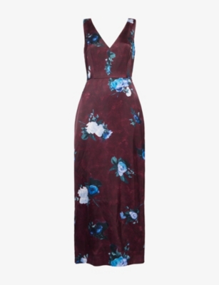 Flower-Appliqué Sleeveless Satin Cocktail Midi Dress
