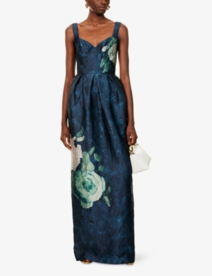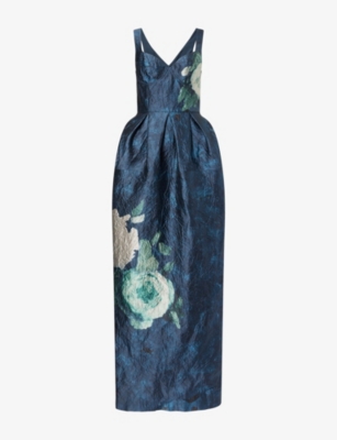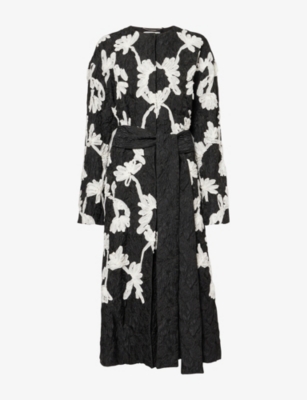 Floral-Embroidered Cocktail Cloque Jacquard Midi Dress