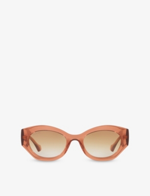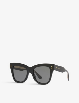 60s inspired and dripping with decadence, our Gucci cat-eye sunglasses for women will make a striking addition to your eyewear collection. As with all Gucci sunglasses, you'll spy the gold-toned lettering stamped on the arms for a signature finish.
