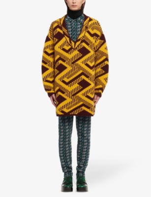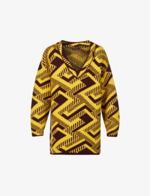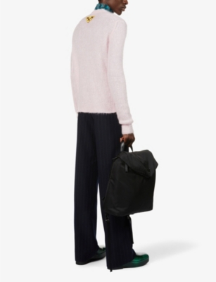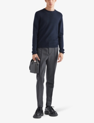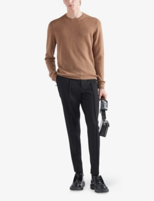 The finely sculpted silhouette of a Prada cashmere jumper is often accentuated with a rib-knit pattern and the eye-catching textured finish works with a variety of looks. Layer a cosy sleeveless v-neck under your coat for winter weather, or wear a chunky large-fit crewneck as outerwear for those in-between days. Designs are based around a minimal aesthetic - think low-key monochrome or primary hues and simple geometric patterns for a classic outfit. Prada's prestige branding takes pride of place on these pieces, stitched precisely on the chest in block capitals or embroidered on tags and panels.