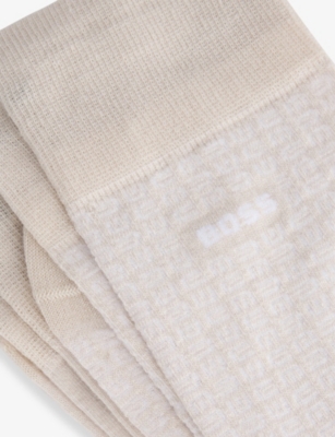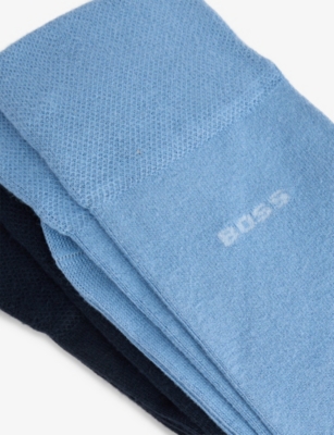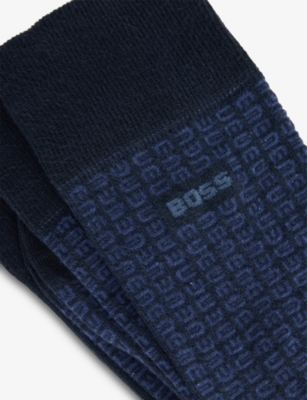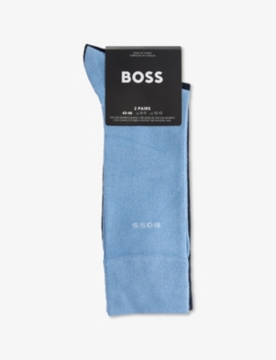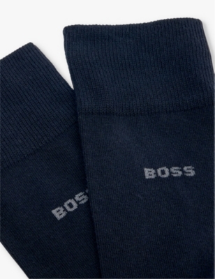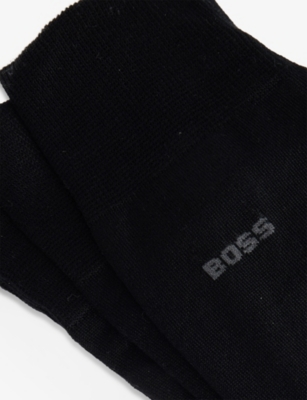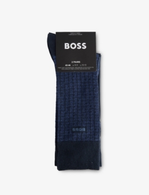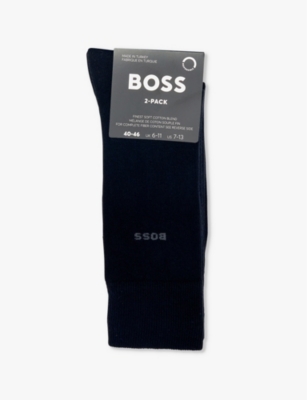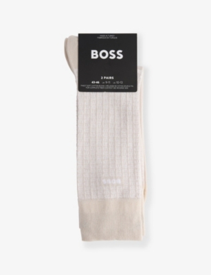 When formal occasions are on the cards, make sure you're smartly styled from head to toe with men's designer dress socks from BOSS. Navy, black and grey designs with discreet branding make ideal accompaniments to tailoring. Mix and match with solo items, or stock up on your favourite shades with a coordinating set. There are plenty of options for laid-back days, too. Explore classic white pairs enhanced with distinctive flourishes. Stripes give ankle-length socks a sporty aesthetic, while logo intarsia allows you to exhibit your preference for the label.