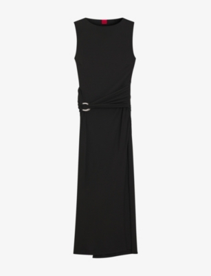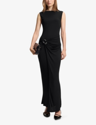 Asymmetric-neckline ruching stretch-woven maxi dress