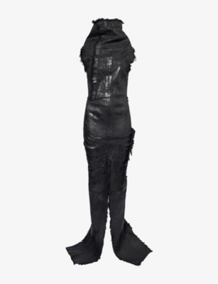 RICK OWENS: Etna Split Coated Denim Maxi DressRICK OWENS: Etna Split Coated Denim Maxi Dress