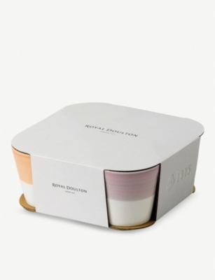 Whether you are looking for a classic white dinner set or something more unique, you'll find stellar British craftsmanship and traditional materials in our Royal Doulton collection. Hosting guests for coffee and cake? Look to the label's sleek stoneware mugs to serve freshly brewed coffee. Pieces with a hand-poured glaze and logo-debossed base offer a classic finish, while the easily stackable design makes storage easy.