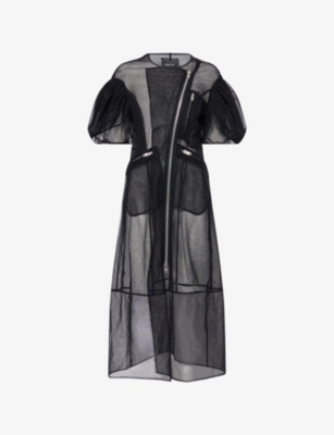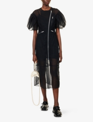 Sculpted Petal-Sleeve Sheer Tulle Knee-Length Dress