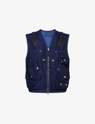 STONE ISLAND: Compass Badge Indigo Denim Utility VestSTONE ISLAND: Compass Badge Indigo Denim Utility Vest