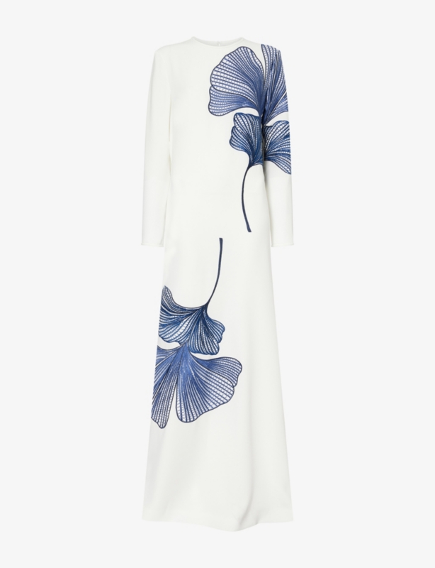 - Regular fit, A-line silhouette, straight-across neckline, strapless, corset boning, crystal appliqué at front, all-over lave embroidery, internal mesh layer, fully lined, flared hem