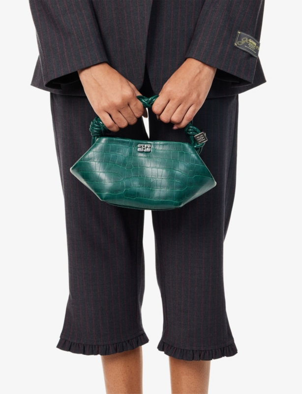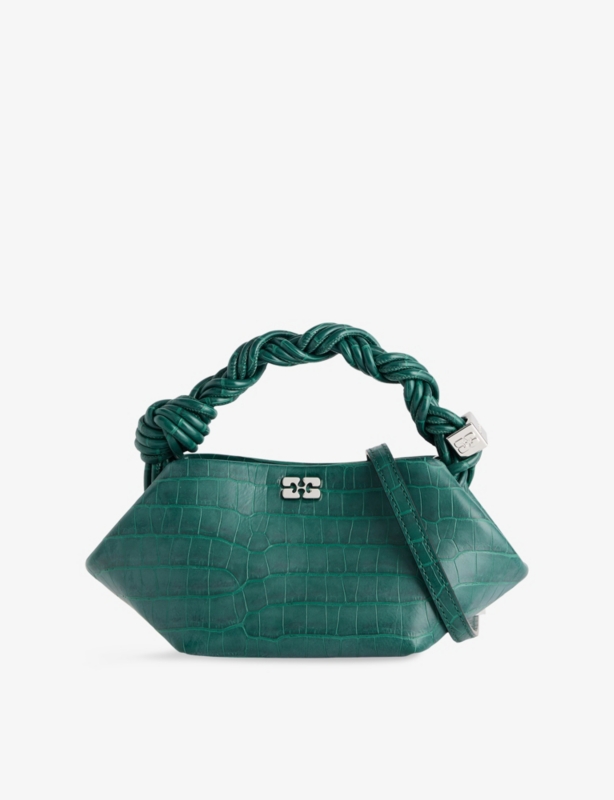 - Curved silhouette, braided top handle, branded hardware cube at handle, detachable adjustable shoulder strap, brand plaque at front, all-over leopard-print pattern, two compartments, card slot at interior, fully lined