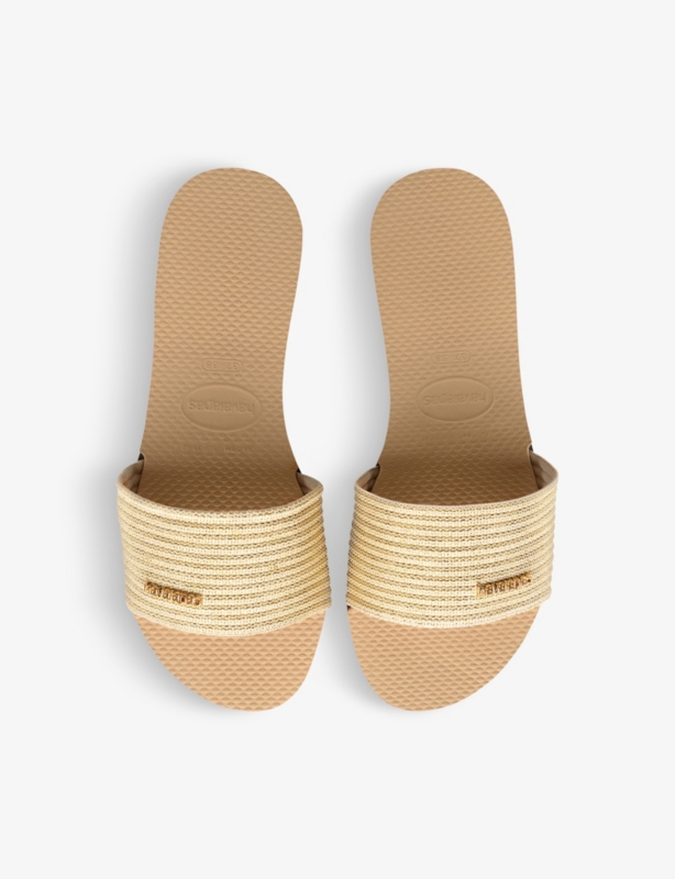 - Open round toe, sling-back style, metallic branded straps, heat resistant, water-resistant, non-slip
