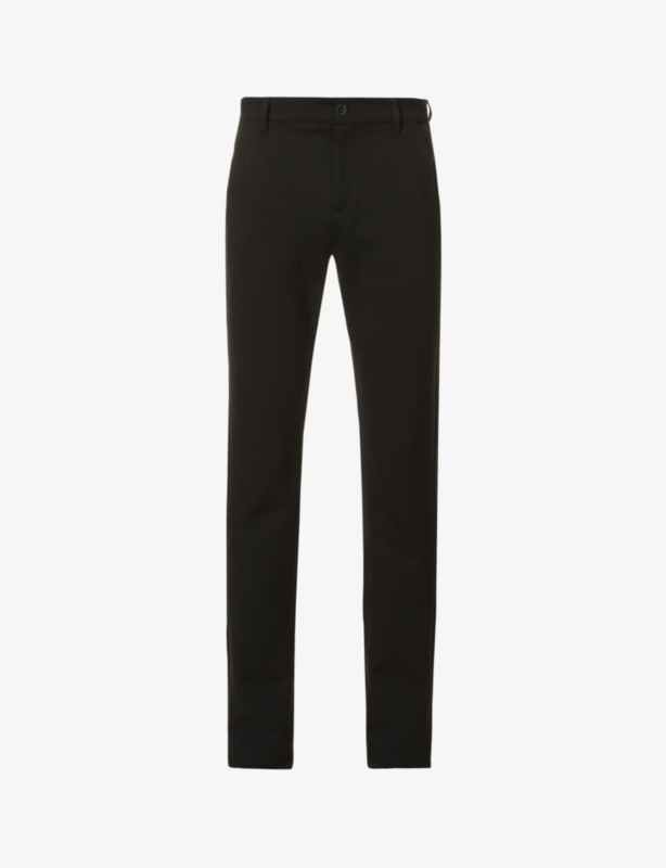 - Slim fit, mid rise, straight leg, belt loops, five pockets, branded hardware, brand patch at back waistband, V-shaped yoke at back