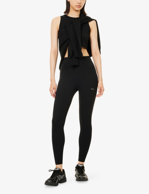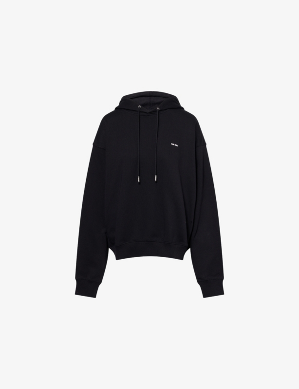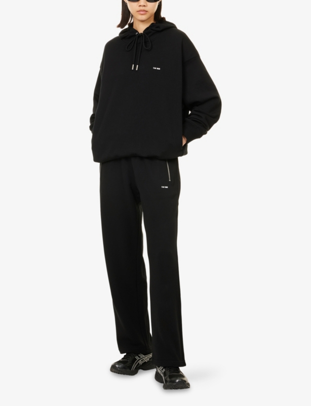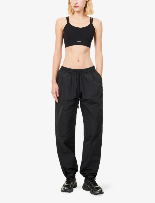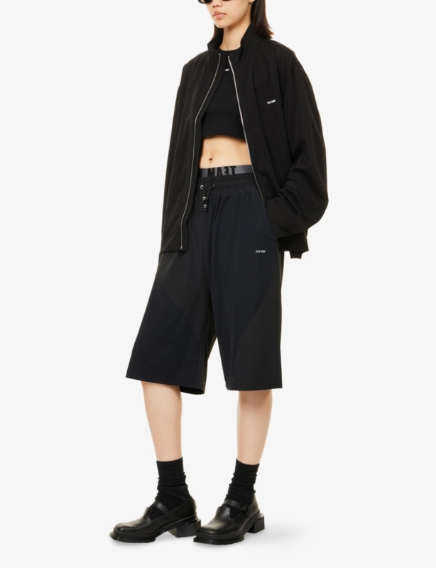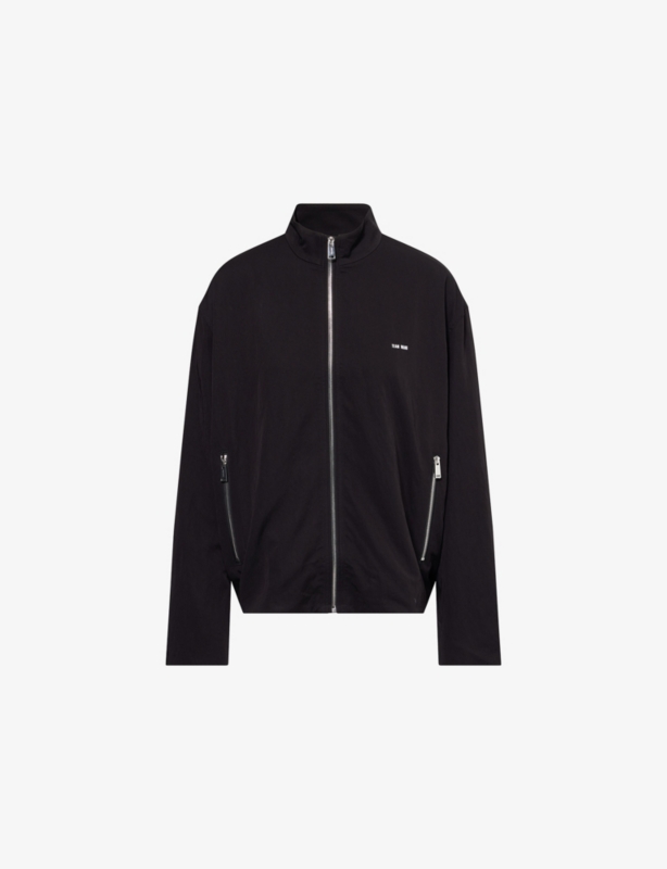 - Stand collar, long sleeves with press-stud fastening, two concealed zipped pockets at front, panelled detailing, embroidered brand text at front and back, knit closure detail at front, elasticated at hem, silver-toned hardware, fully lined