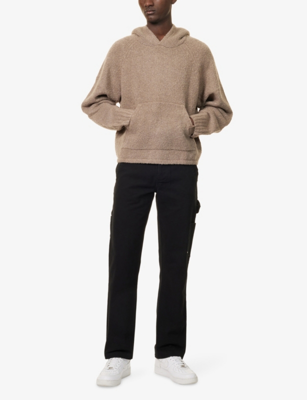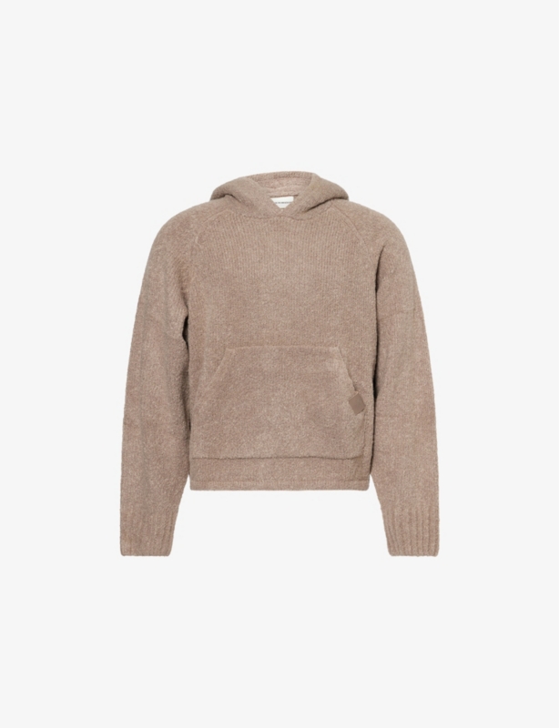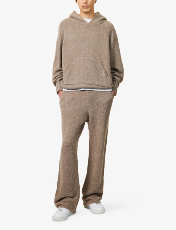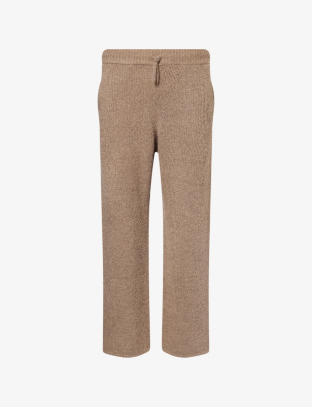 - Relaxed fit, high-rise, wide leg, drawstring elasticated waistband, two slip pockets at front, fluffy monogram intarsia at side, patch pocket at back, all-over knitted