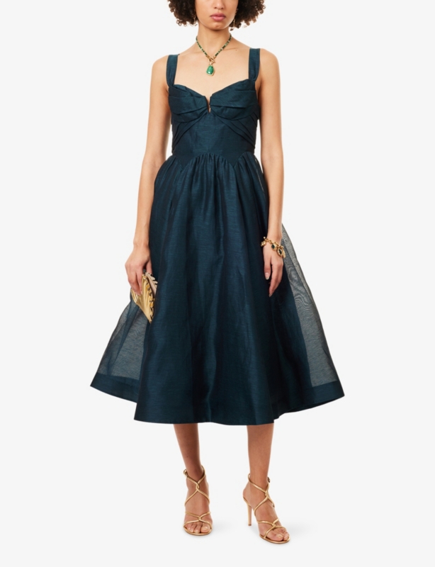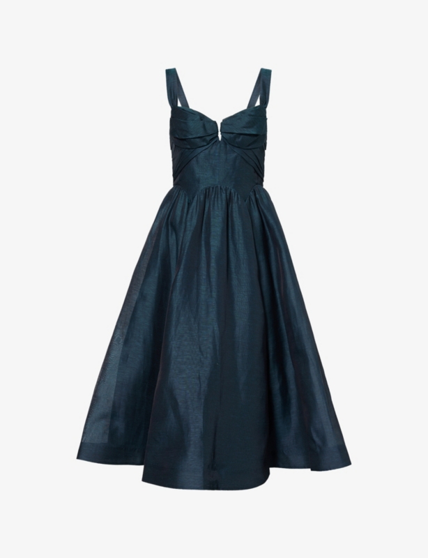 - Regular fit, sweetheart neckline, elasticated shoulder straps, moulded cups, draped panels at front, side boning, shirred panel at back, all-over floral print, internal mesh layer, fully lined, flared hem