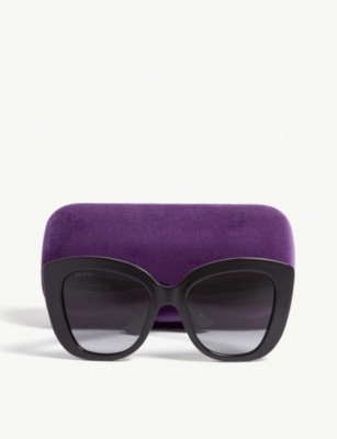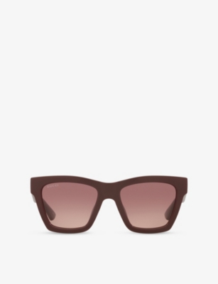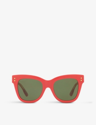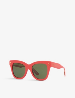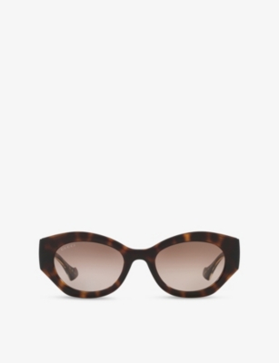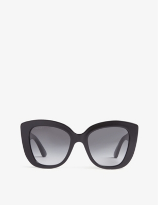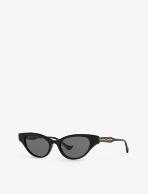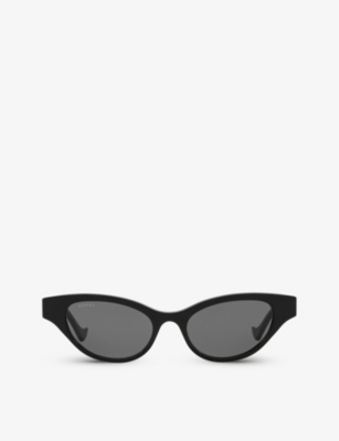 60s inspired and dripping with decadence, our Gucci cat-eye sunglasses for women will make a striking addition to your eyewear collection. As with all Gucci sunglasses, you'll spy the gold-toned lettering stamped on the arms for a signature finish.
