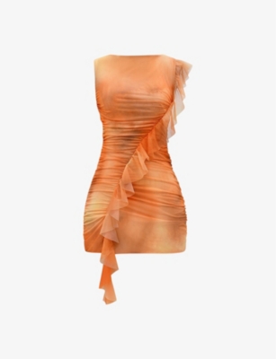 Asymmetric ruffled-hem stretch-mesh midi dress