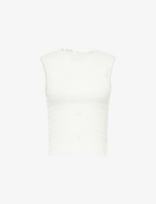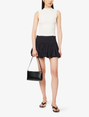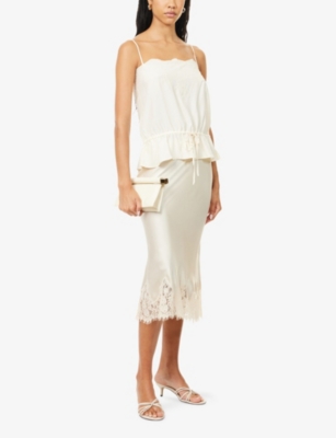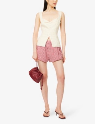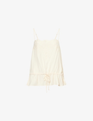 Elsewhere in our lineup, explore looser fits. A Reformation silk top is a dressed-up choice - ruching flatters and brings extra detail, and camisole shapes feel whimsically nostalgic. Opt for designs with easy-going spaghetti straps for wearing on warm-weather days. Or, turn to a silky shirt to embrace androgyny, especially when tucked into tailored trousers. A variety of prints, from angular geometrics to seaside stripes, add statement finishes to your outfit.