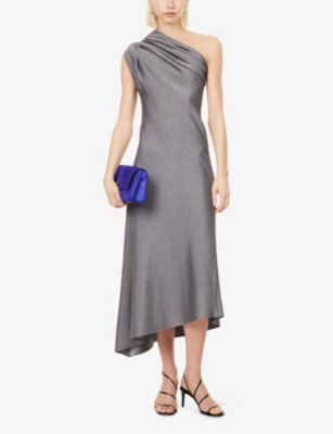 Rhinestone One-Shoulder Stretch-Woven Midi Dress