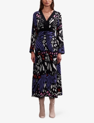 Butterfly-print V-neck satin maxi dress- Discount price:€87.00