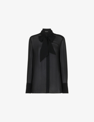 Ruffle-Collar Lace-Trim Textured Silk Shirt