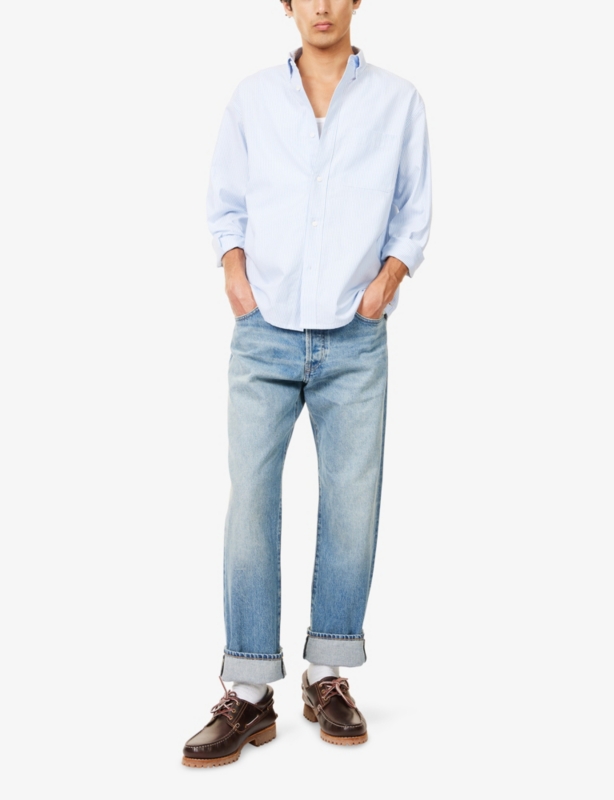 - Regular fit, mid-rise, straight leg, belt loops, five pockets, V-shaped yoke at back, tonal stitching, branded hardware, branded patch at back