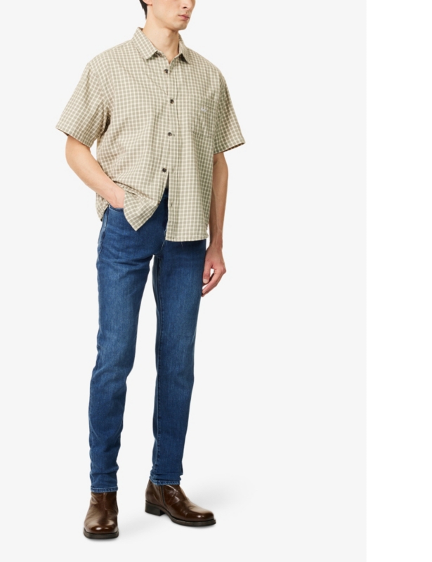 - Regular fit, mid-rise, straight leg, structured waistband, belt loops, classic five pocket design, faded wash, whiskering, branded hardware, contrast stitching, V-shaped yoke at back