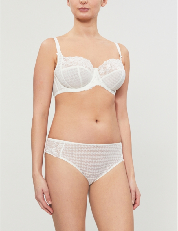 - Full cup, adjustable shoulder straps, bow detail at straps, soft-molded cups, underwired, picot trims, full support