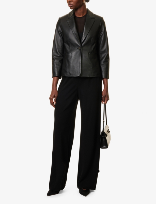 - Relaxed fit, high-rise, wide leg, elasticated waistband, all-over satin texture