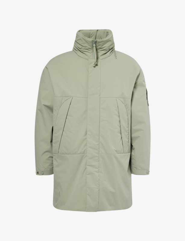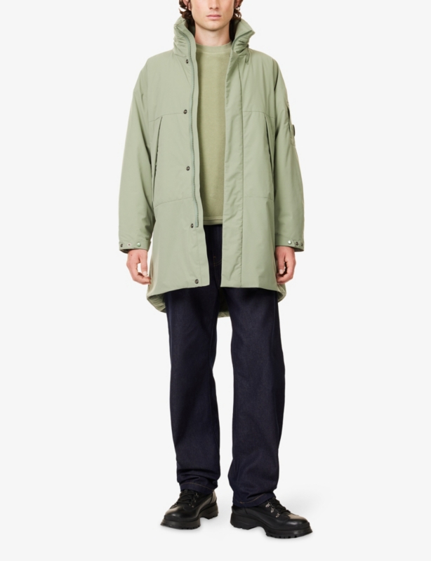 - Drawstring hood, branded goggle-lens detail at hood, long sleeves with adjustable cuffs, four flap patch pockets at front, all-over crinkle effect