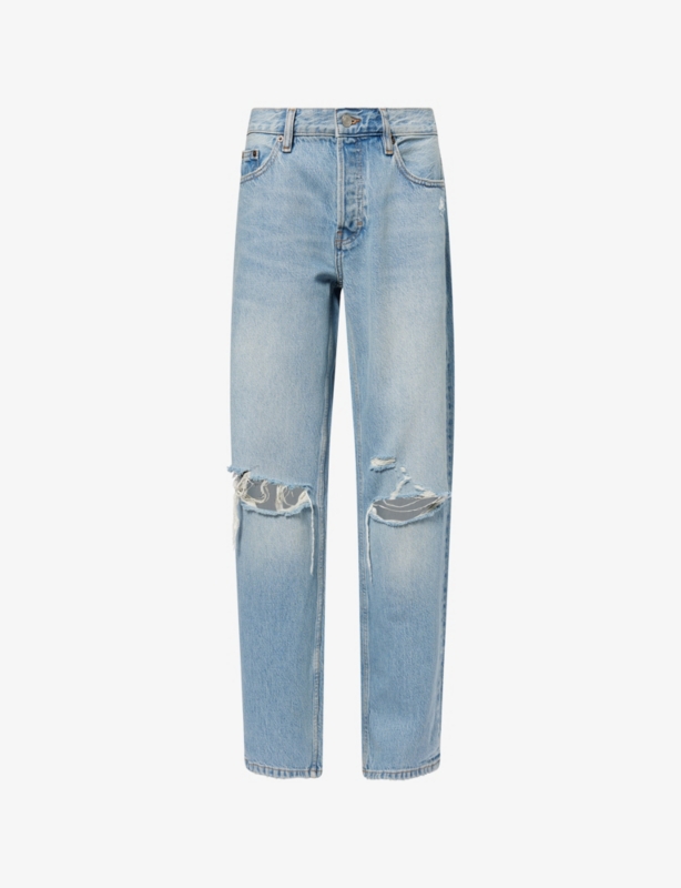 - Slim fit, mid-rise, tapered leg, belt loops, five pockets, branded hardware, partially lined