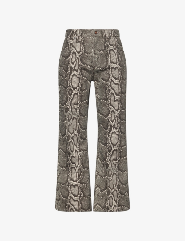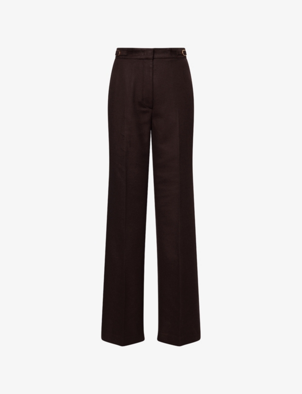 - Regular fit, mid-rise, structured waistband, waist adjusters, pleated flared hem
