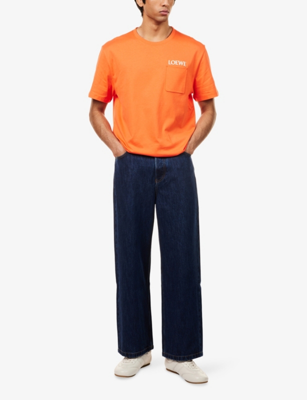 - Relaxed fit high-rise, wide leg, belt loops, five pockets, brand patch and handle at back, all-over twill texture