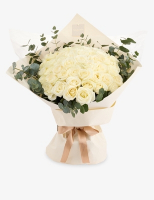 50 White Roses and Eucalyptus Fresh Flower Bouquet