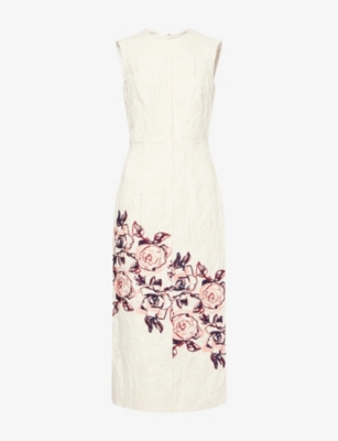 Floral-Embroidered Cocktail Cloque Jacquard Midi Dress