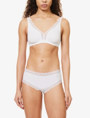 The high-quality natural fibres the pair chose for their craft are still at the centre of the brand's products - with some embellishments picked up in the years since. Soft cotton and lightweight silk are found across the range with intricate lace trims and contrasting colour piping. We've got plenty of pared-back styles too, with neat, clean lines and sleek scoop necks. These pieces are ideal for slipping seamlessly beneath your outfit. Our favourites in the range of Hanro ladies' underwear are engineered for incredible comfort, thanks to soft cups and wire-free designs.