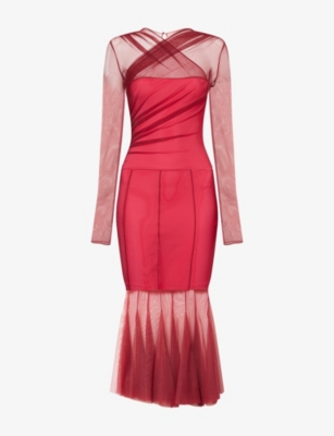 Long-Sleeve Gathered Mesh Woven Midi Dress