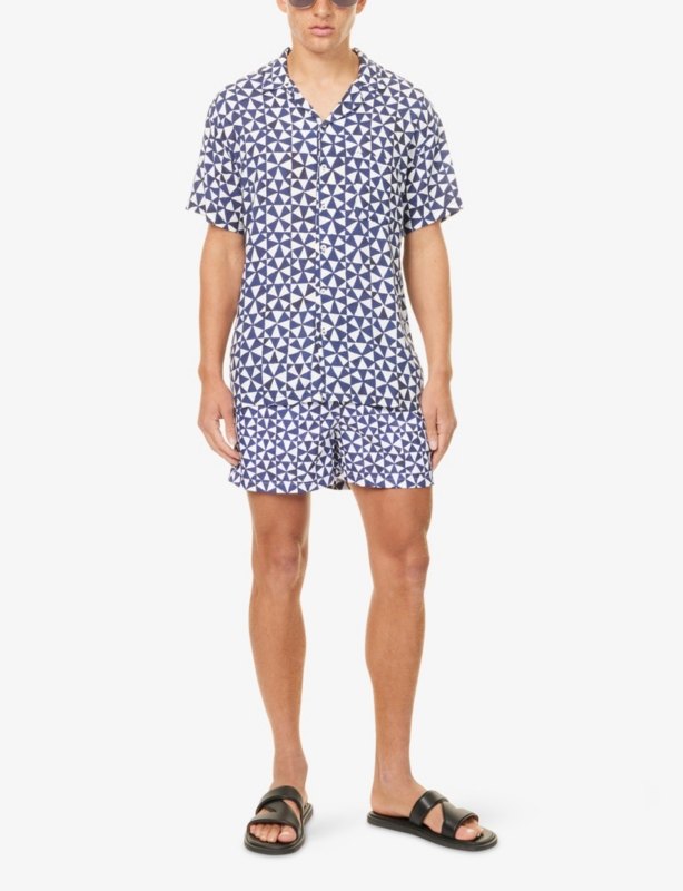 - Relaxed fit, collar, short sleeves, patch pocket at front, straight yoke at back, all-over striped print, split at sides