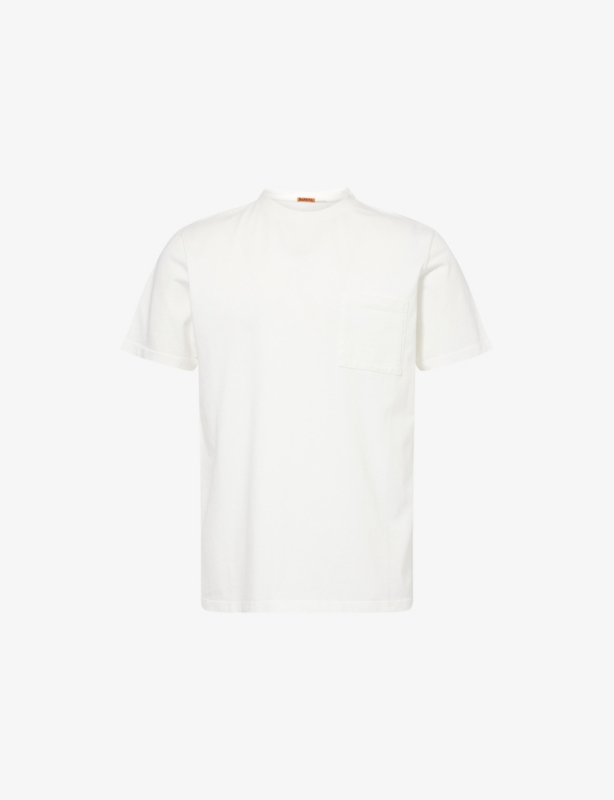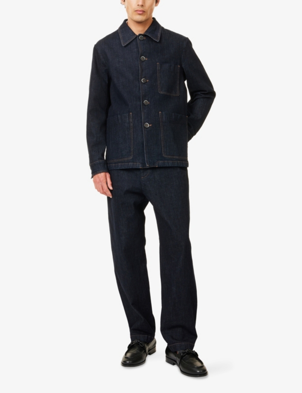 - Pointed collar, long sleeves, buttoned cuffs, curved hem