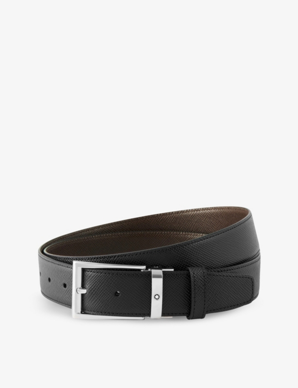 - Square buckle, branded hardware, metal keeper loop, reversible design, buckle spins on axis to reverse, one side checked print, one side plain smooth leather, check-engraved belt loop