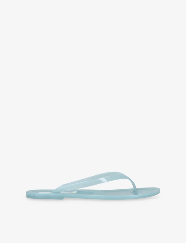 - Open round toe, semi-transparent toe-post and top strap, jelly-like texture, water-resistant finish, flat sole