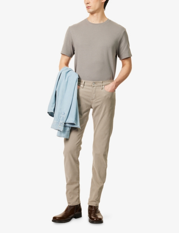 - Regular fit, mid-rise, straight leg, structured waistband, belt loops, classic five pocket design, faded wash, whiskering, branded hardware, contrast stitching, V-shaped yoke at back