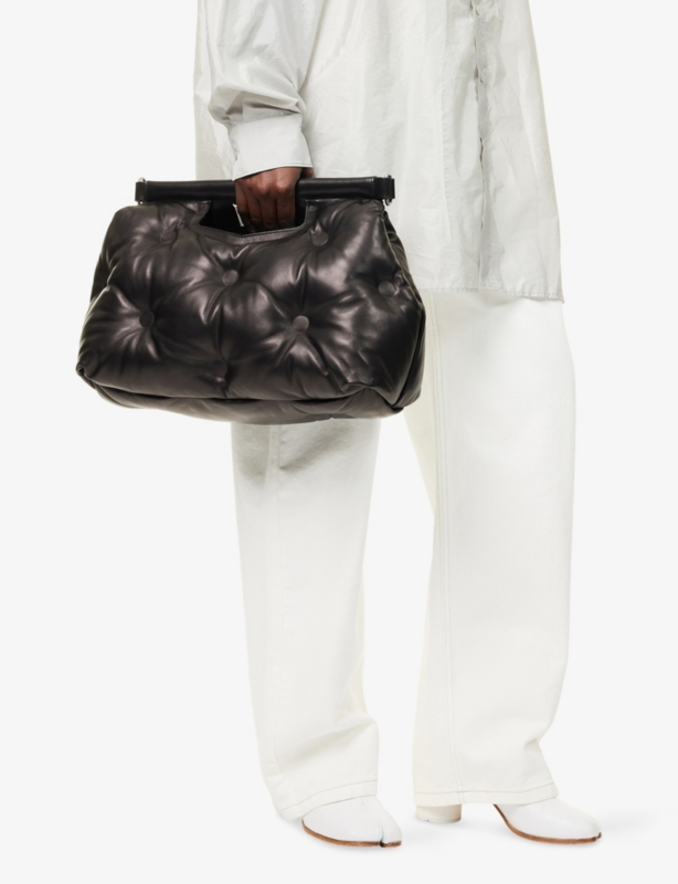 - Double top handles, detachable adjustable strap, foldable panel at top, four stitch signature at front, detachable keyring and tag, key at side, five protective feet at base, all-over suede leather, smooth leather trims, silver-toned hardware, one main compartment, internal zip and slip pockets, internal brand tag, fully lined