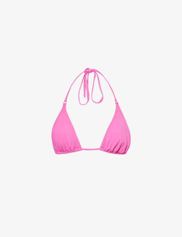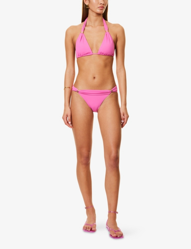 - Halter-neck, self-tie fastening at neck, plunging neckline, gold-toned hardware, detachable cups, gathered at chest, open at back, medium coverage at back, fully lined