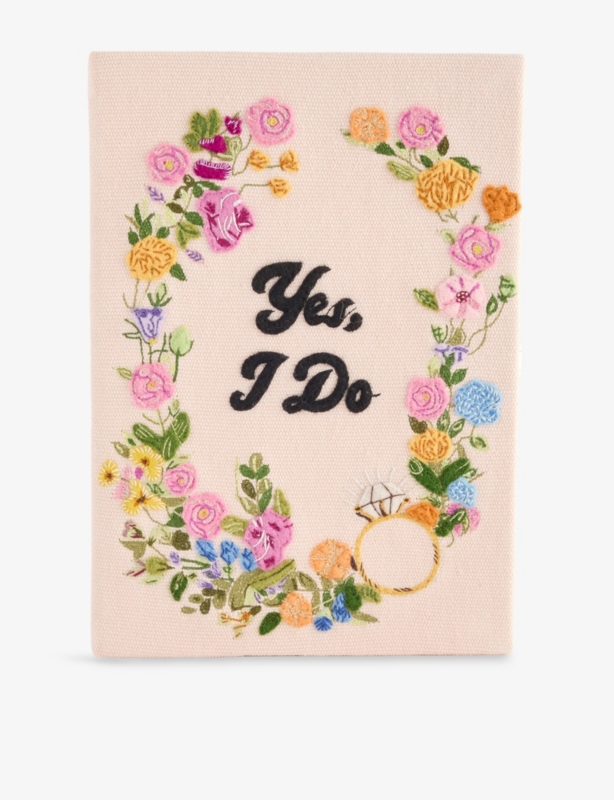 - Book shape, detachable strap, silk embroidery and felt appliqué at front, embroidery at back, one main compartment, slip pocket at interior, floral lining