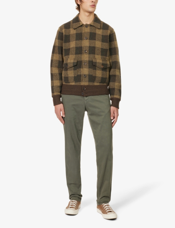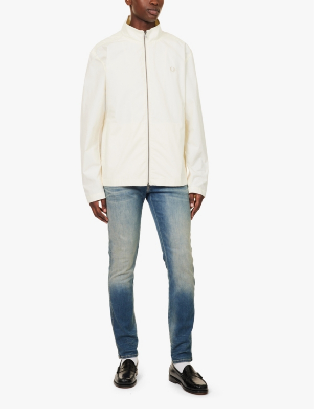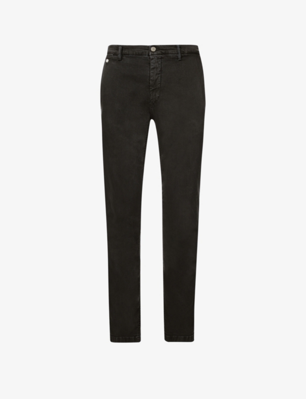 - Mid-rise, slim, belt loops, five pockets, woven brand tab at front pocket, faded wash, branded patch at back waistband, V-shaped yoke at back