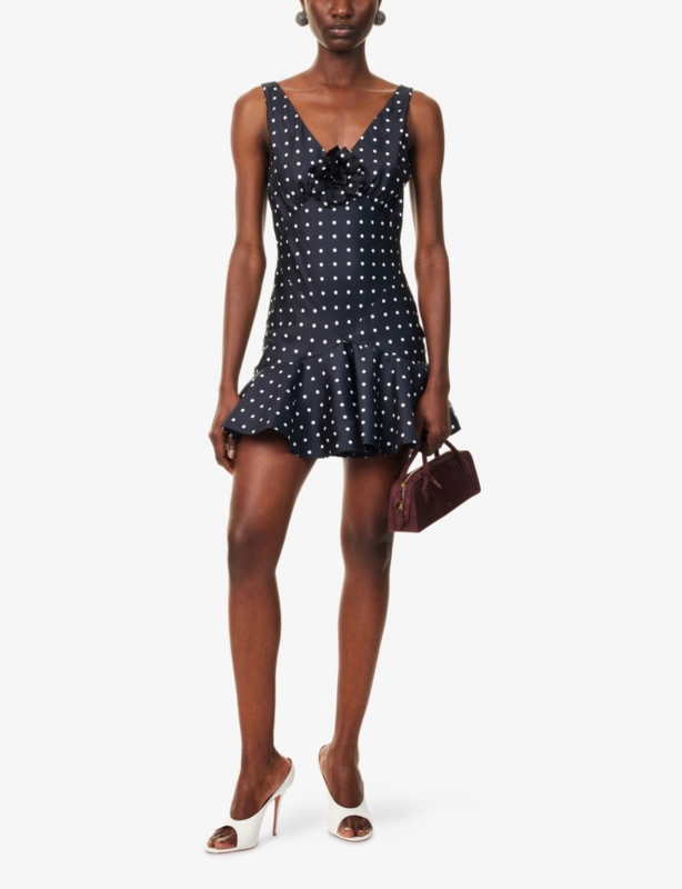 - Regular fit, V-neck, shoulder straps, bow motif at straps, flared hem