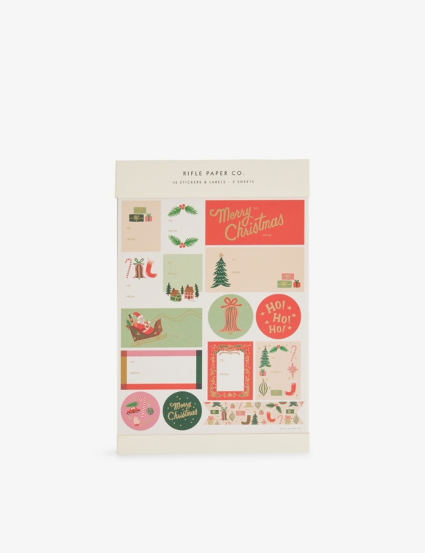 - Three sheets of 45 stickers and labels, Santa themed, illustrated by Rifle Paper Co.